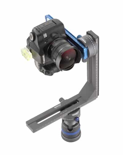 Die Optimierung für den Einsatz von Fisheye-Objektiven erforderte eine neue Konzeption der Panoramaplatten. Die neuen Drehplatten sind extrem schmal gebaut, so dass nichts ins Bild ragen kann. Die integrierten Wasserwaagen sind platzsparend im Schnellwechselsystem der Panoramaplatten untergebracht und von oben durch Ausfräsungen in den Klemmplatten gut zu erkennen. Zudem ist die vordere Feststellschraube, die nur bei stufenlosen Aufnahmen benötigt wird, abnehmbar. Trotz der kompakten Bauweise sind auch schwere professionelle digitale SLR-Kameras problemlos zu verwenden. Das System ist ausreichend dimensioniert, um ein vertikales Durchschwenken der Kamera zu gewährleisten.