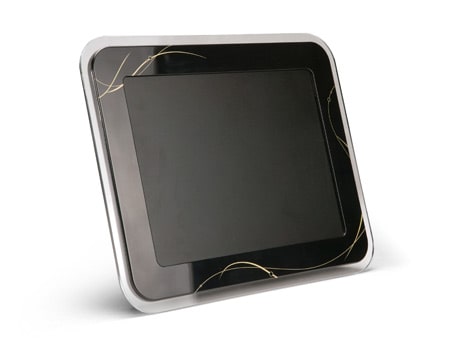 Der Acer AF308 erscheint mit goldfarbenem Wellenmotiv auf tiefschwarzem Innenrahmen und chromfarbenem Rand mit weich abgerundeten Ecken. Dank des eingebauten Standfußes kann der Rahmen wahlweise im Hoch- oder im Querformat aufgestellt werden, wodurch die angezeigten Bilder, je nach aufgenommenem Format, stets richtig angezeigt werden. Das 8 Zoll Display im 4:3-Seitenverhältnis verfügt über eine Auflösung von 800 x 600 Pixeln bei einem Kontrastverhältnis von 400:1, einer Bildhelligkeit von 200 cd/m2 und einer Reaktionszeit von 30 ms. Die Bedientasten sind dezent auf der Rückseite angebracht.