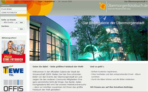 Damit Oldenburg diese Ehre auch tatsächlich zuteil wird, sind CeWe Color sowie die Partner EWE-Tel und Offis auf die tatkräftige Unterstützung aller Event-Besucher angewiesen. Denn ebendiese liefern das Fotomaterial, aus welchem das riesige Fotobuch erstellt werden soll. Jeder der Fotos von den etlichen Veranstaltungen im Zuge der „Übermorgenstadt“ macht, kann diese auf die offizielle Galerie der Stadt der Wissenschaft 2009 unter www.uebermorgenfotobuch.dehochladen und damit Teil des Weltrekordversuches werden.