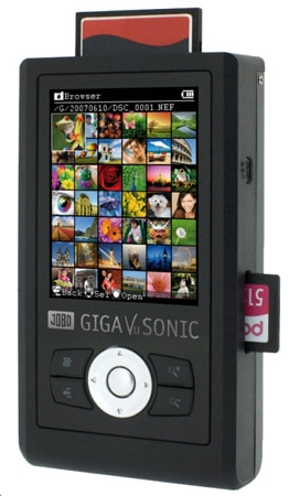 Das größere Modell stellt der Giga Vu Sonic dar, der nicht nur mit einem größeren Display mit einer Diagonalen von 3,2 Zoll aufwarten kann, sondern darüber hinaus auch mit einem größeren Speichervolumen dienen kann – so wurde die 200 GB große HDD gegen ein 250-GB-Modell ausgetauscht. Damit nicht genug, soll der Giga Vu Sonic ebenso mit einer wesentlich höheren Datenrate dienen können. Für 1 GB werden gerade einmal 30 Sekunden benötigt. Ein weiterer Vorteil besteht darin, dass auch RAW-Daten direkt vom verbauten Display angezeigt werden können.