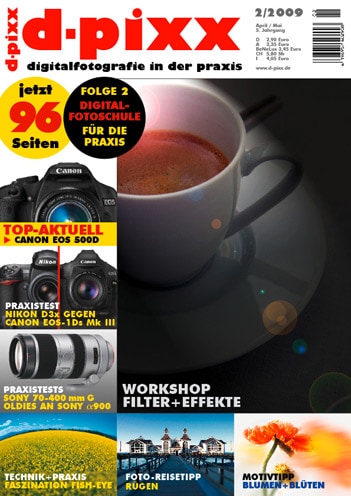 Seit heute früh sind die ersten Daten (Editorial und Inhalt) für unsere kommende Ausgabe 02/2009 online. Erscheinen wird das Heft am 8. April. Das Titelthema ist dieses Mal ein großer Workshop rund um Filter-Effekte. Damit aber nicht genug, gibt es auch mehrere interessante Praxistests – beispielsweise ein Shoot-Out zwischen der Canon EOS-1Ds Mark III und der Nikon D3x oder einen Test des Sony 4-5,6/70-300 mm G. Noch dazu haben wir ausprobiert, wie sich ältere Minolta-Objektive an der Sony Alpha 900 schlagen.