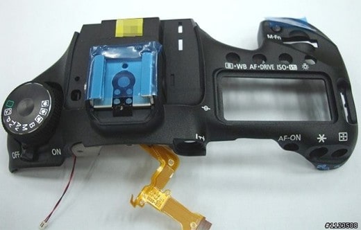 Sollte es sich um ein echtes EOS-Bauteil handeln, fällt auf, dass es hinter dem Auslöser eine neue [M-Fn]-Taste gibt und dass der Hauptschalter nach oben links gewandert ist. Sollte der Hauptschalter tatsächlich seinen Platz unten auf der Rückwand verlieren, könnte das bedeuten, dass es einen größeren und/oder schwenkbaren Monitor gibt, der mehr Fläche auf der Rückwand beansprucht.