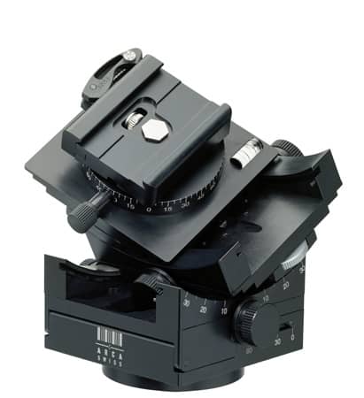 Ermöglicht durch die Präzision und Vielfalt seiner Bewegung¬seinrichtungen eine noch nie erreichte, sichere wie präzise Kamerapositionierung. Die fotografischen Geräte können in zwei Achsen mikrometrisch bewegt werden, da die Bewe¬gung der Kamera im inneren des Kreisbogens erfolgt entsteht kaum eine Veränderung der Gegenstandsweite sowie des Bil-dausschnittes. Ein in der Basis des Stativkopfes befindlichens Panorama dient der Ausrichtung des Aufnahmegerätes. Ein zweites oberhalb der Schwenkeinrichtungen befindliches Panorama erlaubt Schwenkungen bis 360°. Die Befestigung der Kameras erfolgt mit dem patentierten FlipLock® Schnellspannsystem.