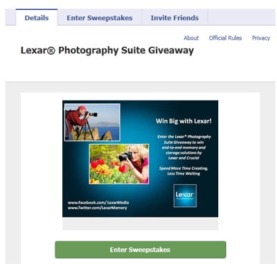 Um teilzunehmen, müssen Facebook-Nutzer ein Fan der Lexar Facebook-Seite werden und an einer Umfrage teilnehmen, welches Produkt ihrer Meinung nach das beste ist, um ihren Arbeitsprozess zu beschleunigen. Der Wettbewerb endet am 15. Juli 2011. Die Gewinner werden per Zufallsprinzip am 18. Juli 2011 ausgewählt.