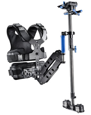 Die Bewegungen des Videografen werden durch einen speziellen Federarm abgedämpft. Dieser Tragearm verteilt zudem das Gewicht von Stativ und Kamera auf eine gepolsterte Weste, sodass lange Aufnahmen ohne großen Kraftaufwand möglich sind.