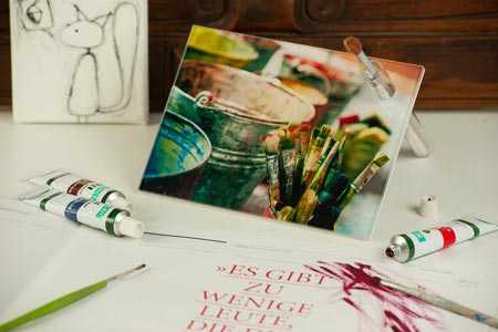 Dieser Druck besitzt allerdings eine Aussparung in dem ein Acryl-Röhrchen als Aufsteller befestigt wird und das als Vase für kleine, filigrane Pflanzen genutzt werden kann.