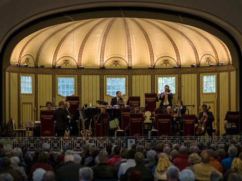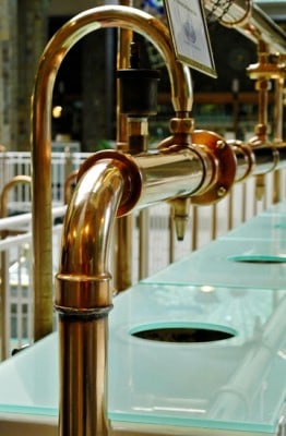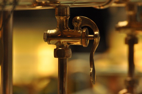 Hier wurde die Innenarchitektur und –einrichtung der Halle aus dem Jahr 1911 zum Motiv, unter besonderer Berücksichtigung des Röhrenwerks der Heilwasser-Zapfanlagen aus goldglänzender Phosphorbronze.