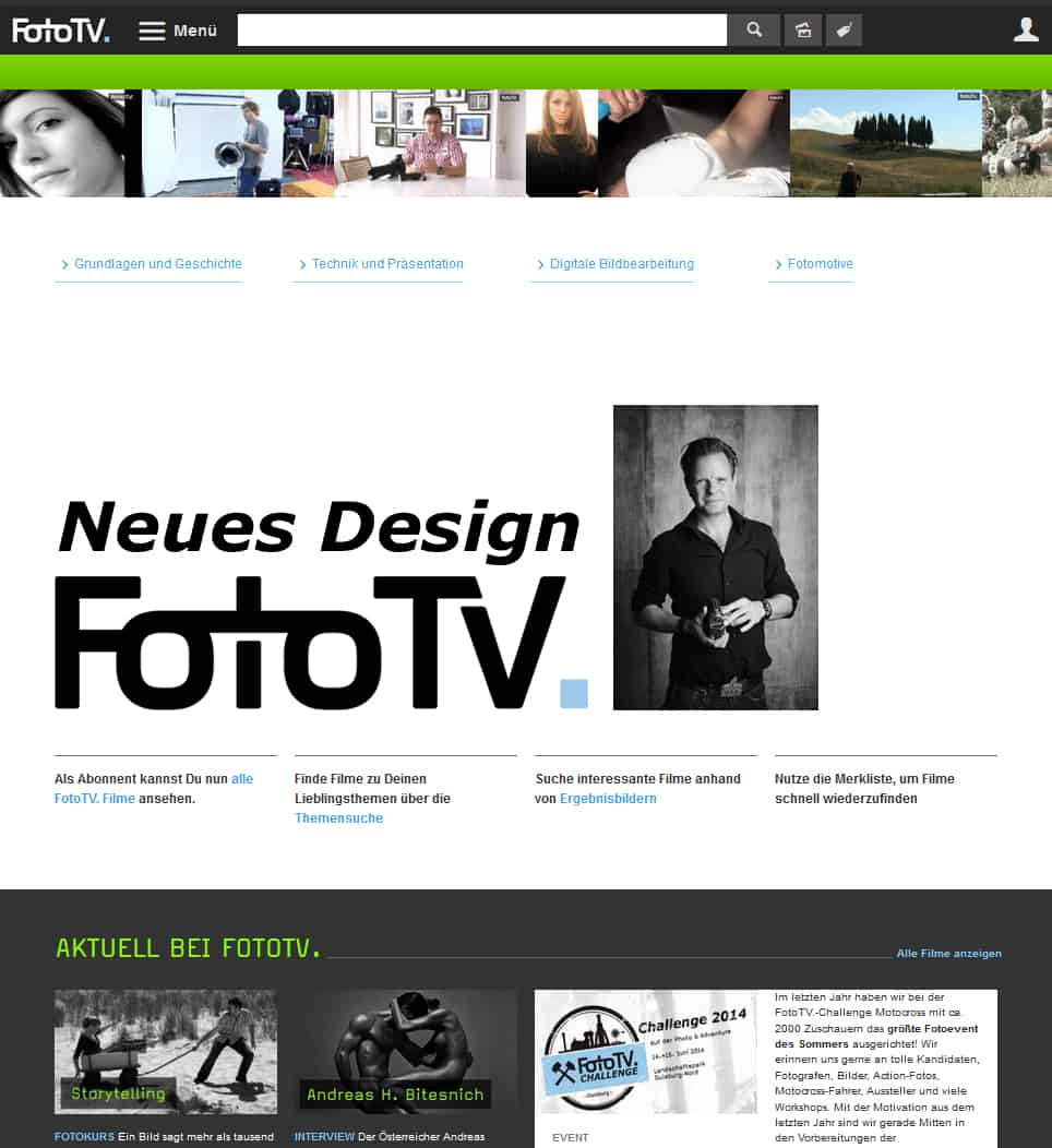 FotoTV.de ist das weltweit größte WebTV über Fotografie und launcht anlässlich seines 7. Geburtstages eine komplett überarbeitete Website. Das neue Designkonzept von FotoTV.de beschleunigt und vereinfacht die Suche nach relevanten Inhalten zum Thema „Fotografie“ auf der über 1.800 Filme umfassenden Website.