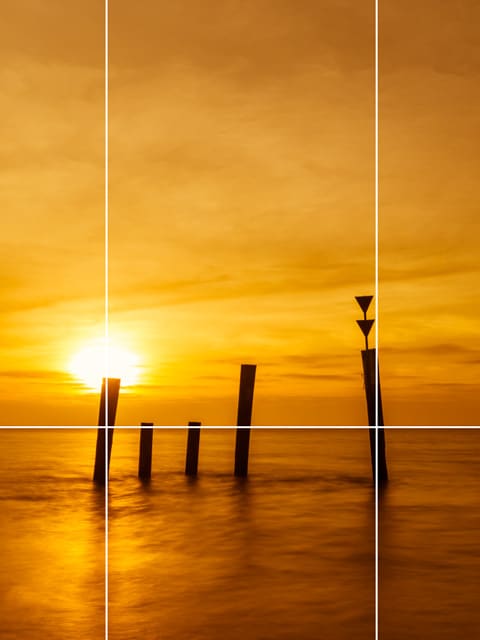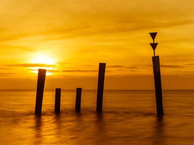 Die nächste Überlegung galt der Positionierung der Bildelemente im Kamera-Display. Horizontlinie, Wasser, Himmel, Sonne und ein paar windschiefe Dalben. Ganz schön viel für ein gutes Bild. Um das Wasser weicher und weniger ablenkend ins Bild zu holen, entschloss ich mich, einen starken Graufilter ND 3 mit 1000-facher Verlängerung, also -10 Lichtwerte, einzusetzen. Wegen der kräftigen Gegenlichtsituation nahm ich eine Belichtungskorrektur von -2/3 Lichtwerten vor. Bei Blende 11 und ISO 100 stellte sich über die Zeitautomatik ein Wert von 5 Sekunden ein. Die reguläre Belichtungszeit ohne Graufilter wäre 1/200 Sekunde (5 Sek. / 1000) gewesen. Nun müsste das Wasser weich und damit weniger gewichtet ins Bild kommen. Sollte ich nun aber mehr den Vordergrund oder mehr den Himmel betonen, also den Horizont im oberen oder unteren Drittel positionieren?