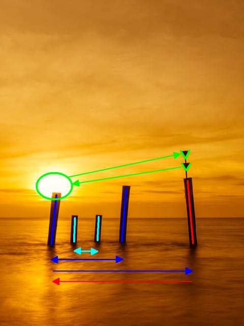 Durch eine intuitive Anordnung der Linien im Bildformat und der Platzierung der Sonne als Gegenpol zu den Dreieck-Punkten erhielt ich eine zufriedenstellende Bildaufteilung. Dabei half mir das eingeblendete Kompositionshilfsraster meiner Kamera. Aber die Spannung war mir noch nicht dramatisch genug und ich probierte einen Wechsel ins Hochformat. Bei der späteren Betrachtung fiel mir der Mengenkontrast auf. Die Gruppe der vier kurzen Linien, wobei zwei ganz kurze durch zwei etwas längere eingefasst werden, in der Gegenüberstellung zur der langen Linie.