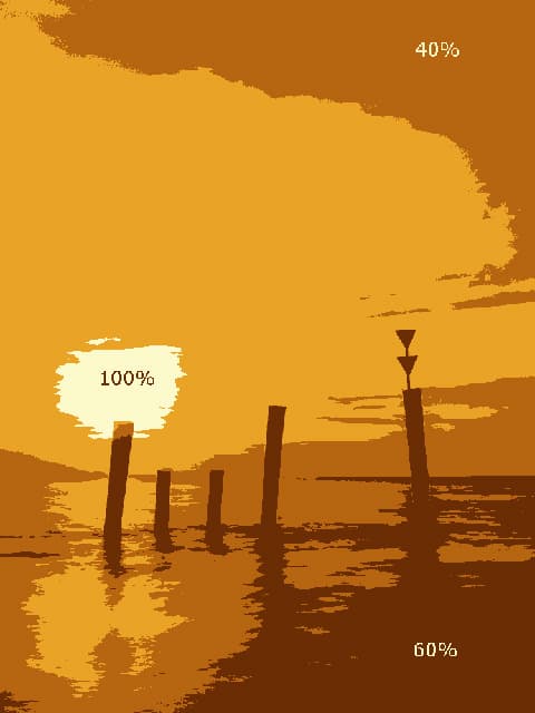 Eine weitere Betrachtung hinsichtlich der Balance der hellen und dunklen Flächen eines Bildes, lässt sich mit der Posterisierung anstellen. Dazu habe ich das Bild auf nur vier Tonwerte reduziert und kann nun die Verteilung der hellen und dunklen Fläche im Bildformat beurteilen. Hierbei wird deutlich, dass die beiden dunklen, dreieckigen Flächen rechts oben und unten durch die weiße Fläche der Sonne recht gut ausgewogen sind. Ich stelle mir besonders dominante Flächen mit einem entsprechenden Gewicht vor und piekse eine gedankliche Nadel ins Bildzentrum. So ergibt sich eine gedachte Waage, mit der sich die Balance eines Bildes ganz gut beurteilen lässt. Die dunklen Dreiecke und die helle, kreisförmige Fläche stellen einen weiteren Formenkontrast dar, der dem Betrachter zwar kaum bewusst wird, für die Gesamtwirkung aber durchaus Ausschlag gebend wirkt.