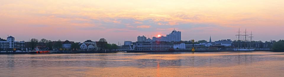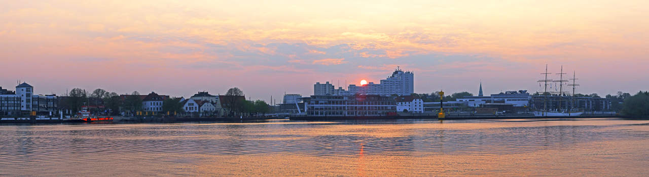 Guten Morgen Vegesack 100 mm [@KB], ISO 200, 1:5, 1/320 Sek., 9 Aufnahmen, freihandMeine tägliche Radtour beginne ich in Lemwerder, an der Weser, auf der gegenüberliegenden Seite von Bremen-Vegesack. Schon das Warten auf das Fährschiff brachte mir manch tolles Bild ein und auch Panoramen sind in der kurzen Zeit machbar. Mit Blick auf das andere Weserufer, begrüßt mich die Morgensonne über Bremen-Vegesacks Skyline. Schnell die Kamera aus der Packtasche gefummelt, das Zoomobjektiv auf 100mm [@KB] eingestellt, den Bildausschnitt mit dem größten Helligkeitsanteil mit Mehrfeld angemessen, im manuellen Modus Blende 5 bei ISO 200 mit einer leichten Überbelichtung eingestellt und die Schärfe auf die Gebäude gespeichert. Links angefangen und immer schön im Hochformat mit einer Drittelüberlappung ein Bild nach dem anderen nach rechts drehend aufgenommen. Darauf achtend, dass der Horizont im Sucher immer an der gleichen Stelle bleibt. Fertig. Und schon ist die Fähre da. – Los geht’s.