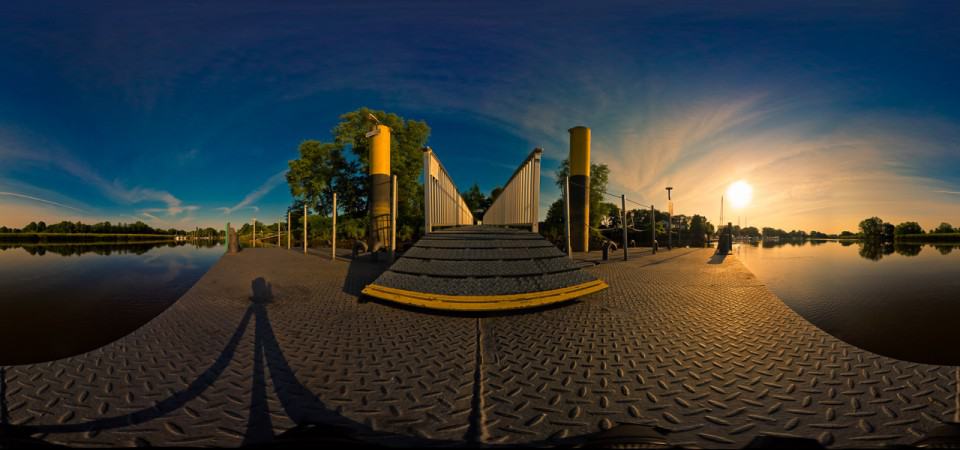 KnicksBaum 34 mm [@KB], ISO 100, 1:11, 1/4 Sek.Die Suche geeigneter Motive führte mich auch zu recht komplexen Bildkompositionen. Ein kleiner Anleger zog mich immer wieder an. Die gelben Dalben, die die Landungsbrücke flankieren, brachten mich auf die Idee für ein 360°-Panorama. Den geeigneten Aufnahmestandort hatte ich schnell gefunden und dabei entschieden, dass der Anleger das zentrale Element im Bild werden musste. Schwierig war, dass ich das Stativ am Rand des Anlegers aufstellen musste und der Ponton schwankte. Ich brauchte drei Anläufe, bis das Licht mitspielte und ich die Technik beherrschte, mich und meinen Schatten zwischen den Einzelaufnahmen zu verstecken.