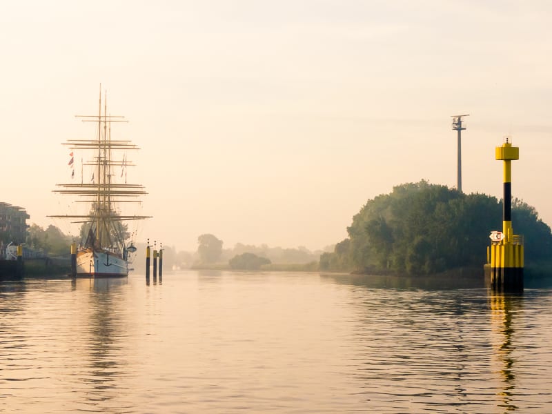 Während der Fährüberfahrt hat man kurz einen schönen Blick in die Lesum-Mündung und auf das Schulschiff Deutschland. 85 mm [@KB], ISO 200, 1:8, 1/340 Sek.Während der Fährüberfahrt erblicke ich rechts die „Schulschiff Deutschland“. Sie hat als Museumsschiff in der Lesum-Mündung ihren festen Ankerplatz gefunden. Dort beginnt meine eigentliche Tour, sieben Kilometer am Ufer der Lesum entlang. Doch zuvor muss ich noch die 42 m lange, stählerne Fußgängerklappbrücke, die seit 1999 über das Vegesacker Hafenbecken führt, überqueren. Wenn sich über ihr der Himmel durch die Morgenröte verfärbt, erscheint mir die Brücke wie das Tor zu einem Weg in einen viel versprechenden, neuen Tag.