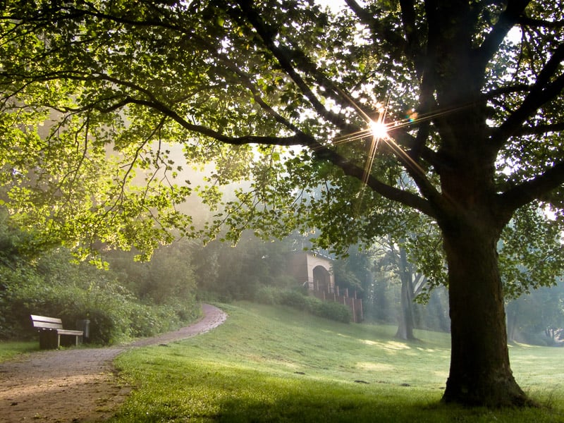 Vegesack im Nebel 28 mm [@KB], ISO 64, 1:2,5, 1/80 Sek.Möchte ich allerdings im Knoops Park das schöne Morgenlicht erleben, muss ich mich beeilen und etwas in die Pedale treten. Der 65 Hektar große Park schließt Gutshäuser und großzügige Freiflächen in alte Baumbestände ein. Aussichtspunkte am hoch gelegenen Lesumhang, wie zum Beispiel die Jünglingshöhe, bieten einen unvergleichlichen Blick über den Fluss.