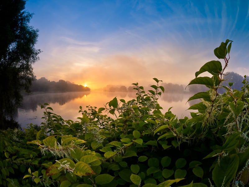 Alte Bäume filtern den Morgendunst, der sich, von der aufgehenden Sonne illuminiert, wie ein mystischer Schleier über die beliebte Lichtung der Jünglingshöhe legt. 42 mm [@KB], ISO 200, 1:8, 1/60 Sek.Unterhalb der Jünglingshöhe, von der Spitze einer in der Lesum liegenden Halbinsel hat man einen herrlichen Blick stromaufwärts. Zudem liegt sie geografisch günstig, um dort den Sonnenaufgang zu erwarten. Ich suche diesen Ort häufig auf, denn nur wenn Wetter und Zeitpunkt stimmen, offenbart sich dieser kurze Moment in seiner ganzen, stimmungsvollen Pracht.