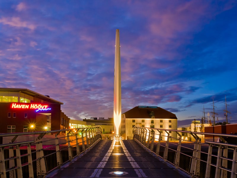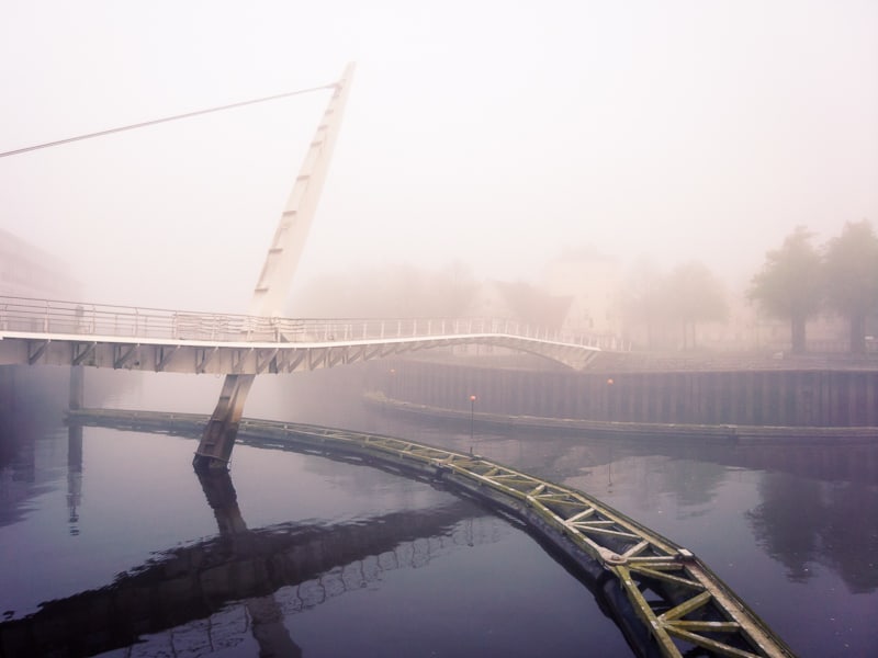 Als sich mir der Himmel so farbenprächtig bot, konnte ich nicht anders, als mein kleines Reisestativ vorsichtig auf den mittig vor der Brücke aufgestellten Betonpfeiler aufzusetzen, um ein Bild zu machen. 34 mm [@KB], ISO 100, 1:11, 20 Sek.Wenn an manchen Tagen der Frühnebel besonders dicht ist und noch durch den Vegesacker Hafen wabert, komme ich nicht daran vorbei ein paar Fotos zu schießen. Hier treffe ich auf architektonische Motive, die sich thematisch völlig von den sonst landschaftlichen Motiven unterscheiden. Eine willkommene Abwechslung, noch bevor ich richtig losradeln kann.