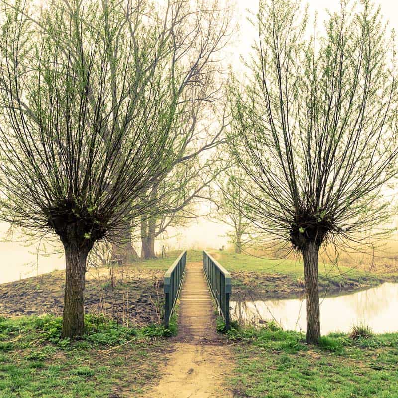 Von der Spitze der Halbinsel hat man einen herrlichen Blick stromaufwärts über den gemächlichen Fluss. Zudem liegt sie geografisch günstig, um von dort den Sonnenaufgang zu erwarten. 15 mm [@KB], ISO 100, 1:11, 1/30 Sek.Die Halbinsel erreicht man über eine Brücke, die im Frühjahr ein von mir gerne fotografiertes Motiv geworden ist. Gesäumt von zwei Weiden, die nach dem Winterschnitt nun wieder ausschlagen, bildet sie einen geheimnisvollen Zugang auf die Landzunge.