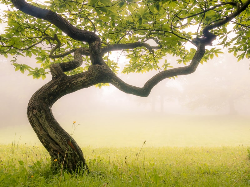 BrückenWächter 28 mm [@KB], ISO 100; 1:8, 1/15 Sek.Auf meinem Weg komme ich auch an meinem Lieblingsbaum vorbei. Es ist ein kleiner, zierlicher Maronenbaum (Esskastanie). Er steht aus fotografischer Sicht etwas unglücklich am Rand einer kleinen Mauer und rechts und links zwischen größeren Bäumen eingezwängt. Außerdem hat sein Stamm eine „geknickte“ Form die fast wie Körpersprache wirkt. Für mich eine Herausforderung diesen Lebenskünstler freizustellen und würdevoll abzulichten. Unzählige Male hatte ich das Bäumchen in den Sucher genommen, aber erst die richtige Wetterlage, ein Nebelmorgen, brachte mir mein Lieblingsbild.