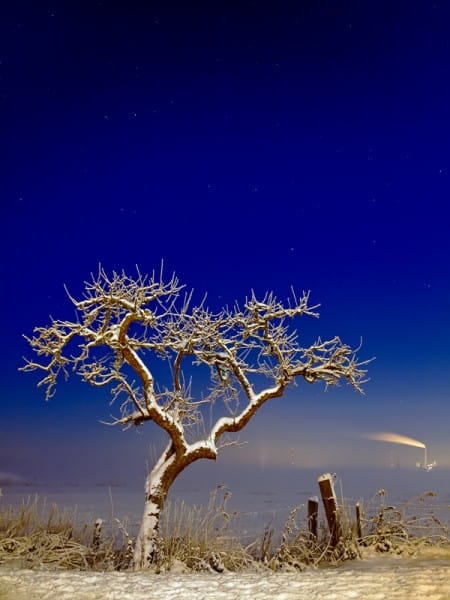 Bäume haben es mir wirklich angetan. Sie sind aber auch ideal für die Taschenlampen-Ausleuchtung. Man muss das Licht nur gut verteilen und darf die Astspitzen nicht vernachlässigen. Hier musste ich die Ausleuchtung aus verschiedenen Gründen sehr rasch vornehmen. Der Baum stand an einer Landstraße und es fuhren einige Autos vorbei, mein Standpunkt war recht nahe am Baum und dieser war mit Schnee bedeckt. Alles Faktoren, die schnell zu einer Überbelichtung führen können. Aber nach nur drei Versuchen gelang mir dieses Bild.