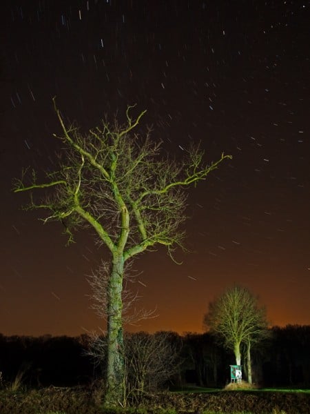 Dieses Motiv hatte mich schon oft bei Tag beschäftigt. Irgendwann fiel mir auf, dass die Himmelsrichtung mit der Position des Polarsterns harmoniert. Acht Besuche bei Nacht waren nötig, bis ich die Aufnahmetechnik im Griff hatte und das Wetter mitspielte. Der Baum im Vordergrund und die Baumgruppe mit Jägersitz leuchtete ich je eine Minute von links und rechts mit einer starken Taschenlampe aus. Zu guter Letzt setzte ich einen Spot von etwa 10 Sek. auf den Hochsitz, um ihn zu betonen.