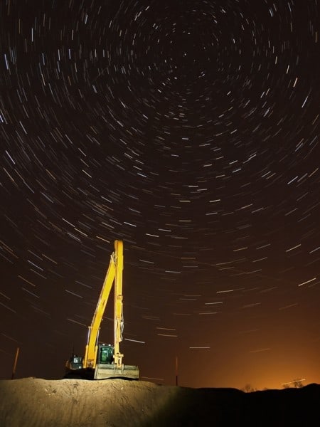 Zufällig stieß ich auf der Suche zu einem Nachtmotiv auf einer Baustelle auf diesen abgestellten Bagger. Er stand so günstig zum Polarstern, dass ich sofort handeln musste, denn in der nächsten Nacht hätte der Bagger schon wieder wo anders abgestellt sein können. Weil ich die Sterne sehr gewichtig ins Bild holen wollte, entschied ich mich für die Startrail-Technik und machte 16 Bilder a eine Minute Belichtungszeit und ein Dunkelbild. Den Bagger leuchtete ich während einer Einzelbelichtung mit der Taschenlampe an. Ich hatte Glück, denn ein Flare-Iridium (Iridium-Satellit) und drei Flugzeuge sind in der Sternenrotation mit abgebildet.