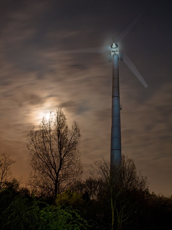 Hier habe ich mit einem Freund zusammen die Szene ausgeleuchtet. Das Licht für die Büsche im Vordergrund, den Mast und den Spot auf das Zentrum des Propellers kam aus der Taschenlampe. Der Freund hat drei Blitzlichter auf den Propeller gerichtet, gleichzeitig gezündet und damit die Rotorblätter eingefroren. Etwas Glück gehörte dazu, dass die Rotorblätter genau in diesem Winkel abgebildet wurden.