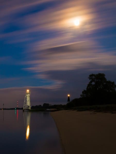 Ein Landschaftsmotiv bei Nacht und Gegenlicht verhält sich im Grunde nicht anders als am Tag. Der Vollmond ist wie die Sonne eine starke, punktförmige Lichtquelle und führt schnell zu einer Überbelichtung. Die ziehenden Wolken haben hier die Leuchtkraft des Mondes abgeschwächt und bilden über die Belichtungszeit einen Bewegungskontrast zur statischen Umgebung. Um den Leuchtturm nicht als Silhouette abzubilden, habe ich ihn mit einer starken Taschenlampe aufgehellt.