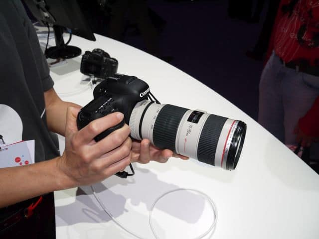 Die EOS 7D Mk II sieht dabei gar nicht so neu aus, die Verbesserungen gegenüber der 7D stecken im Wesentlichen innen drin. Das Bild zeigt übrigens sehr schön die steile Perspektive: Die kleine Kamera im Hintergrund ist in echt genauso groß, wie die im Vordergrund.
