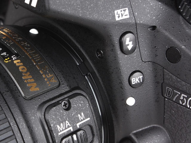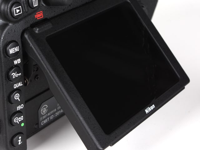 Obwohl die D750 also auch auf den harten Einsatz im Outdoor-Profibereich abgestimmt wurde, weist sie als erste Vollformat-DSLR in dieser Klasse einen beweglich gelagerten Monitor auf. Die ebenfalls auf den Profieinsatz zugeschnittene Olympus E-3 hatte ihn schon 2007 zu bieten. Und während der Monitor der Olympus in zwei Achsen bewegt werden konnte, kann man den 3,2-Zöller der D750 nur bis zu je 90° nach oben und unten klappen. Aber schon das ist ein Riesenfortschritt gegenüber einem fest montierten Bildschirm. Der Monitor weist eine 1,23 Mio Dots auf, rund 300.000 mehr als bei der D700, aber nicht mehr Pixel. Der Grund dafür ist, dass sich nun jeder Bildpunkt aus einem roten, einem grünen, einem blauen und einem zusätzlichen weißen Subpixel zusammensetzt, was der Helligkeit des Sucherbildes zugute kommt.