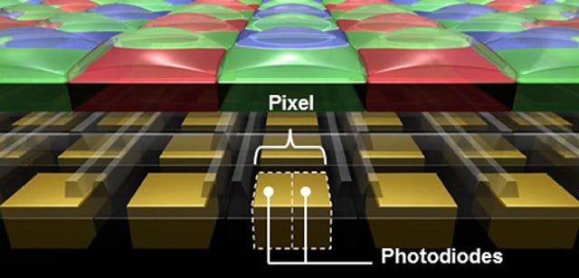 Dual-Pixel bedeutet, dass eine Hälfte eines Bildpunktes – kann man von einem AF-Sub-Pixel sprechen? – Licht registriert, das durch die linke Hälfte des Objektiv gefallen ist, während die andere Hälfte Licht aus der rechten Objektivhälfte aufzeichnet. Dadurch ist es möglich, den Aufnahmesensor bei Foto- bzw. Filmaufnahmen im Live-View-Modus für die Scharfstellung per Phasendetektion zu nutzen, und das in einer sehr großen Fläche (ca. 80 % des Bildfeldes).