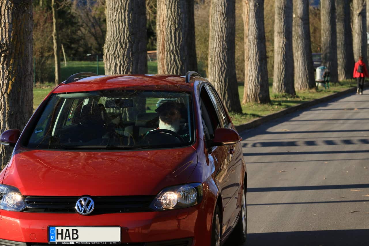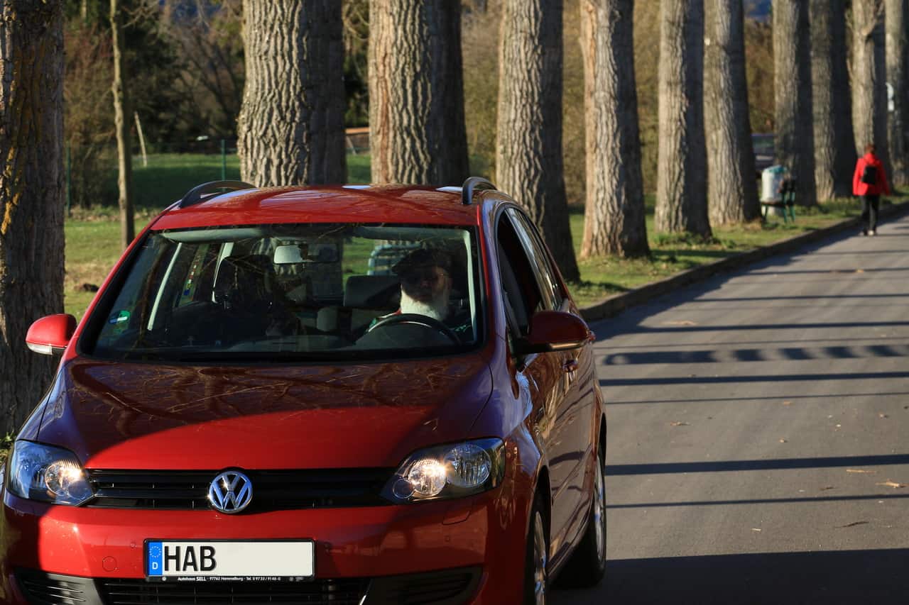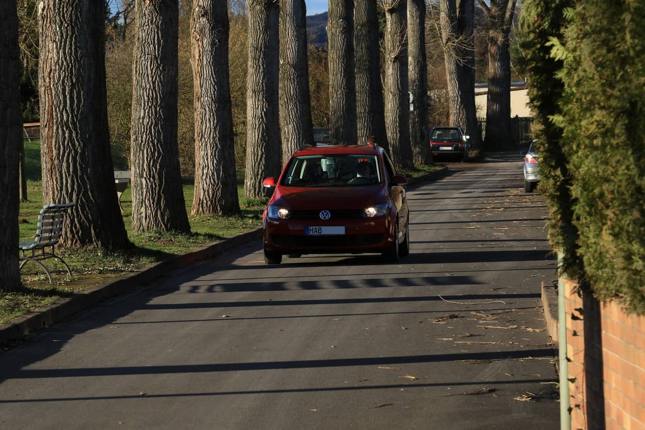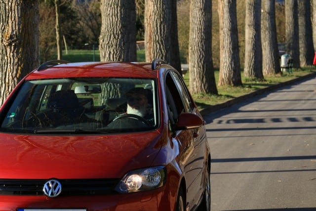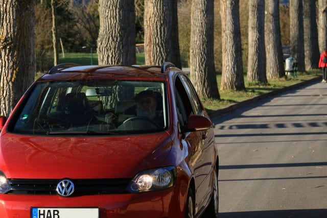 Die Serie entstand mit 10 Bilder pro Sekunde. Beim ersten Bild wurde das AF-Messfeld auf den roten Wagen ausgerichtet. Der AF verfolgte das Auto während der folgenden 33 Bilder, die hier nicht zu sehen sind und hielt es auch in der Schärfe, bis es an mir vorbei fuhr. Die Geschwindigkeit lag bei 30 km/h.