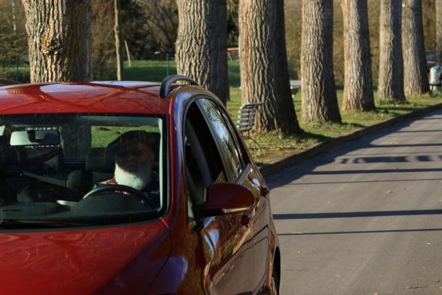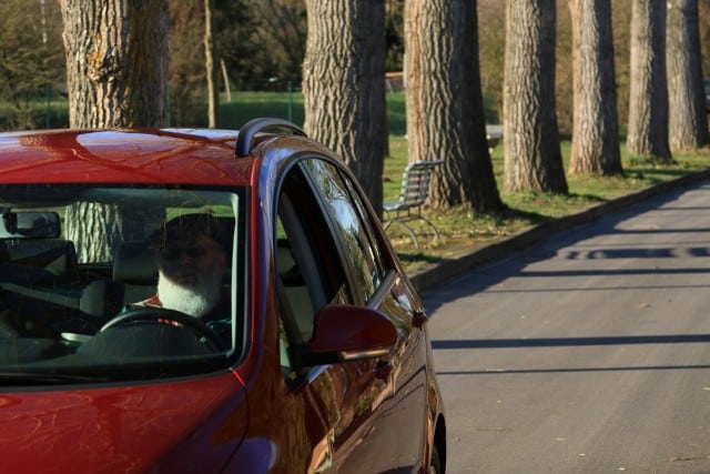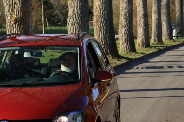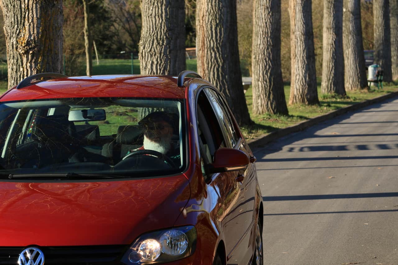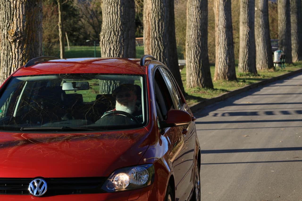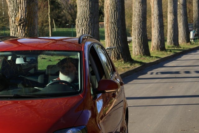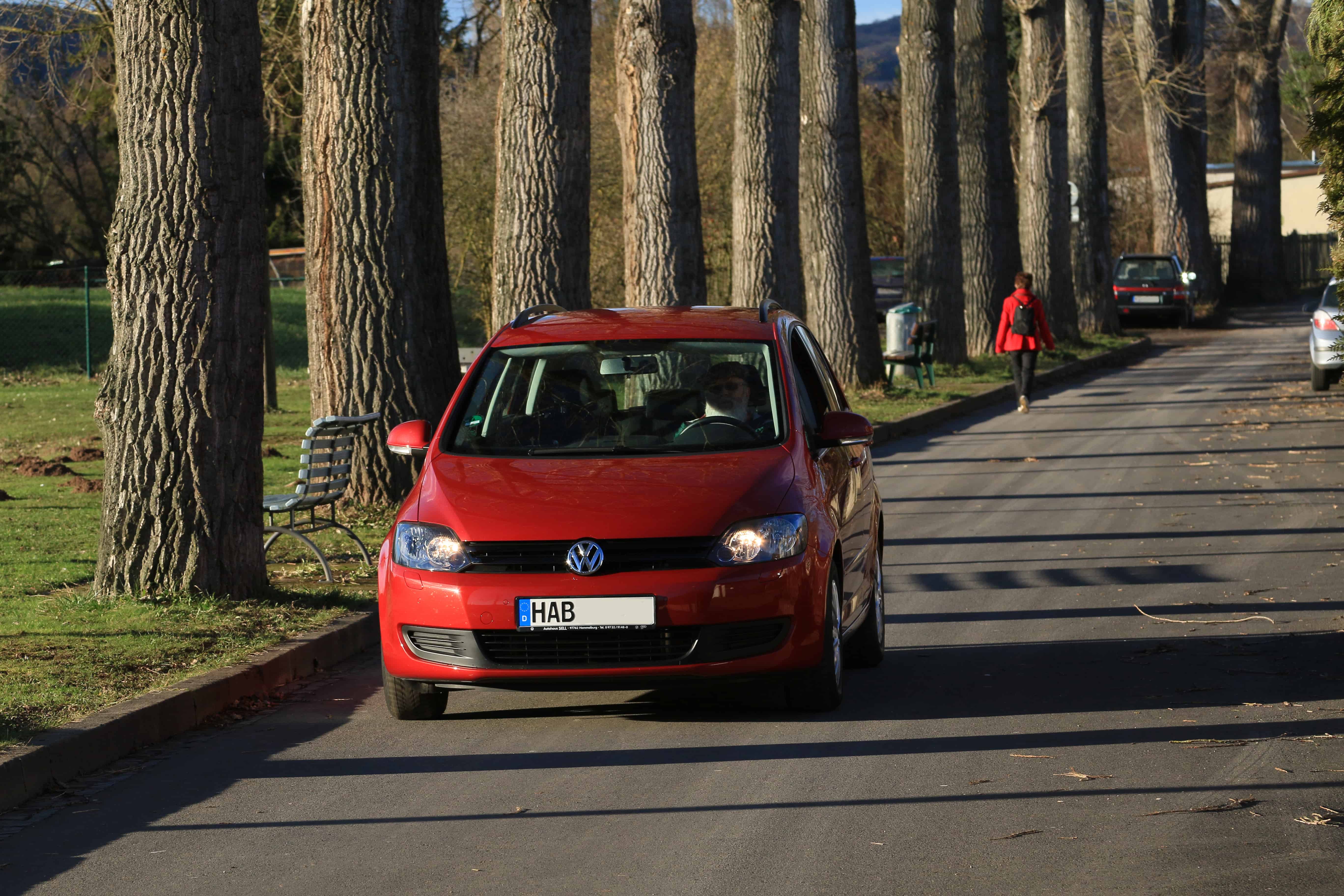 Die Serie entstand mit 10 Bilder pro Sekunde. Beim ersten Bild wurde das AF-Messfeld auf den roten Wagen ausgerichtet. Der AF verfolgte das Auto während der folgenden 33 Bilder, die hier nicht zu sehen sind und hielt es auch in der Schärfe, bis es an mir vorbei fuhr. Die Geschwindigkeit lag bei 30 km/h.