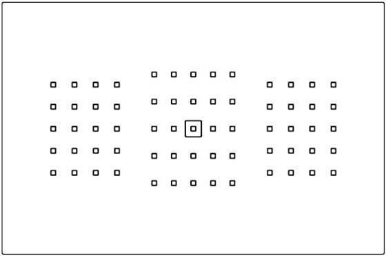 Außerdem kann man jeden der drei oben erwähnten Blöcke auswählen, damit nur dessen Messfelder für die Scharfstellung herangezogen werden, oder man kann alle 65 Messfelder aktivieren und die Kamera das passende Messfeld aussuchen lassen.