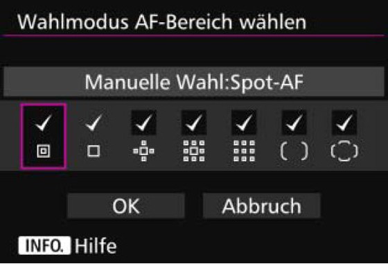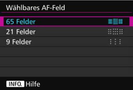 … ob alle oben erwähnten AF-Bereiche von Spot-AF bis zu allen 65 AF-Messfeldern für die Wahl des AF-Bereichs angeboten werden sollen.