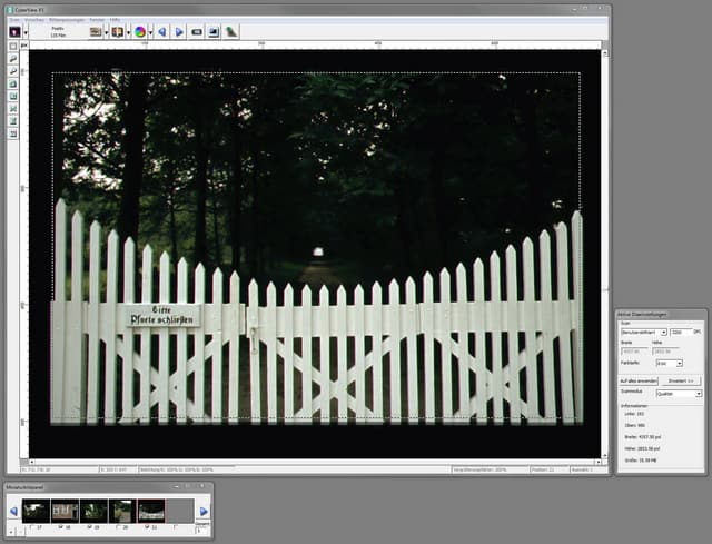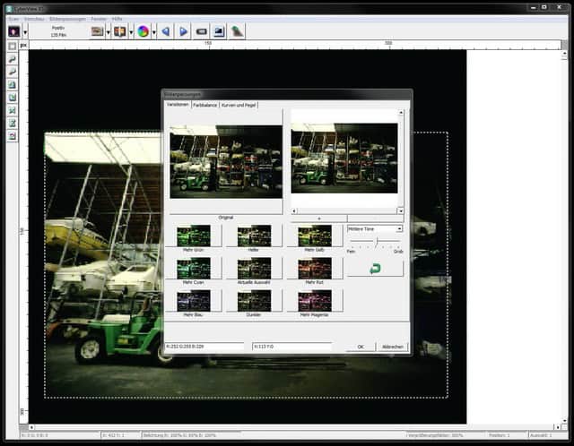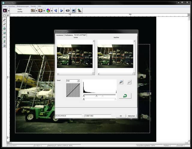 Wichtiger als ein bisschen mehr oder weniger Staub ist die Farbwiedergabe. Dabei fiel auf, dass der Scanner Bilder lieferte, die deutlich zu dunkel und zudem cyanstichig waren, als wir im Menü „Voreinstellungen“ die Funktionen „Auto Belichtung“ und „Auto Balance“ deaktivierten. Nachdem diese wieder eingeschaltet waren, kamen die Bilder mit sehr guten Helligkeits-, Kontrast und Farbwerten, die sich, wenn nötig, in der Scansoftware Cyber View X 5 in einem gewissen Umfang noch optimieren lassen.