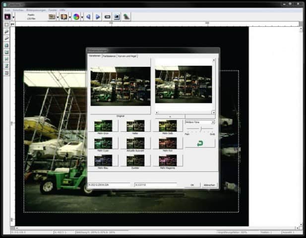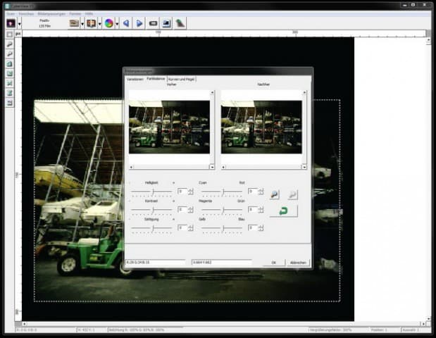 Auf der Karteikarte „Farbbalance“ lassen sich Helligkeit, Farbigkeit und Sättigung verändern, sowie mit drei Reglern die Komplementärfarben Cyan/Rot, Magenta/Grün und Gelb/Blau beeinflussen.