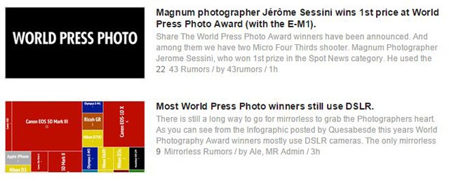 Es ist alles eine Sache der Statistik. So meldet die Seite 4/3 Rumors stolz, dass der Gewinner des World Press Photo Awards, der Magnum Fotograf Jérôme Sessini, das Siegerbild mit einer microFourThirds-Kamera aufgenommen hat, nämlich mit einer Olympus OM-D E-M1. Das spricht auf den ersten Blick für den Siegeszug der spiegellosen Systemkameras. Parallel berichtet Mirrorless Rumors, dass die meisten Gewinner des WPPA mit DSLR-Kameras fotografierten, was fast schon eine Untertreibung ist.