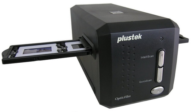 Der Diascanner von Plustek ist ein eher unscheinbarer schwarzer Kasten mit drei Bedienelementen auf der Frontplatte.