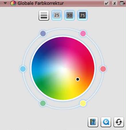 Global CC beeinflusst alle Farben im Bild. Liegt etwa ein leichter Magenta-Schleier über dem ganzen Bild, kann man ihn hiermit wegziehen. Allerdings kann man „Global“ etwas einengen, indem man die Korrektur gezielt auf die Viertel-, Halb- oder Dreivierteltöne beschränkt, oder anders ausgedrückt: auf die Lichter, die Mitten und die Schatten. Das hilft, wenn durch Farbkippen gegenläufige Farbstiche in den Lichtern und Schatten vorhanden sind.