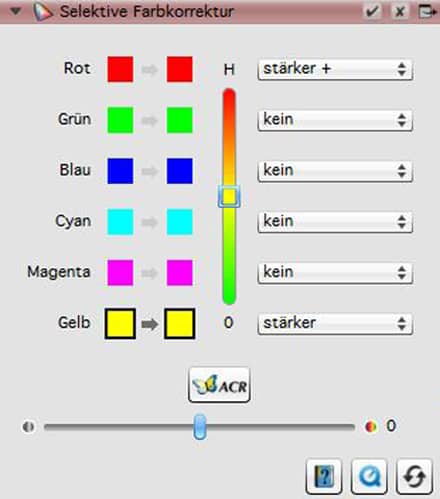 Mit der selektiven Korrektur kann man, logisch, einzelne Farben beeinflussen, also z. B. störendes Blau aus Rottönen entfernen. In dieses Werkzeug eingebunden ist die Adaptive Farbwiederherstellung (ACR). Man kann sie der Automatik überlassen oder per Schieberegler selbst bestimmen, was passiert. Und was passiert? Die Sättigung wird verringert oder erhöht, wobei das Verhältnis der Farbtöne zueinander erhalten bleibt.