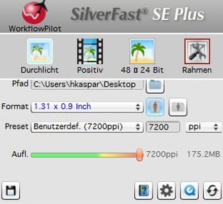 Für die ersten Scans bietet sich die Arbeit mit dem WorkflowPilot an, der schrittweise durch einen Scan-Vorgang führt: Quelle und Ziel wählen / Vorschauscan / Abtastauflösung festlegen, wobei nur die Werte 1800 dpi, 3600 dpi und 7200 dpi zur Verfügung stehen / Aktivieren der Multi-Exposurefunktion für bessere Zeichnung in Lichtern und Schatten / Dateiname und Speicherort festlegen / Scan.