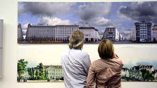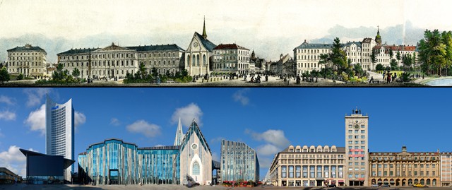 Noch bis 13. Juni kann im Oberlichtsaal der Stadtbibliothek Leipzig das größte Architekturpanorama der Welt bewundert werden. Das aus Hunderten von Einzelbildern zusammengesetzte Foto wird einer Lithographie von 1850 gegenüber gestellt, so dass die Veränderungen mit einem Blick erfasst werden können.