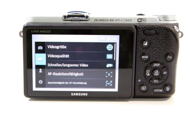 Auf der Rückseite verbaut Samsung recht weit oben das zweite Einstellrad, das mit dem Daumen gut erreichbar ist, allerdings ebenfalls gerne etwas größer sein könnte. Darüber hinaus gibt es die klassische 4-Wege-Wippe mit einem zentralen Bestätigungs-Feld. Um dieses Element herum sitzen noch einmal vier Tasten. Damit können das Menü aufgerufen und die bisherigen Bilder angezeigt oder gelöscht werden. Als praktisch erweist sich die FN-Taste, die einen schnellen Zugriff auf die wichtigsten Funktionen ermöglicht. Abgerundet wird die Bedienung von einer dedizierten Taste zum Start der Filmaufnahme. Diese ist erfreulicherweise so positioniert, dass sie nicht aus Versehen aktiviert werden kann.