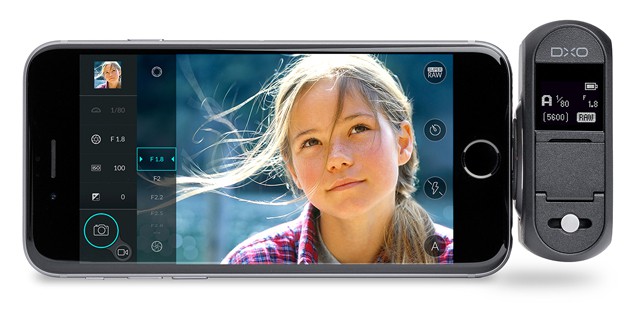 Eigentlich ist die DxO eine „halbe Kamera“, genauer gesagt ist sie ein Aufnahmemodul, das an bestimmte iPhone- und iPad-Modelle angesteckt und dann über eine kostenlose App gesteuert werden kann. Der Monitor des Smartphones wird zum Sucher, der im Adapter um +-60° gedreht werden kann.