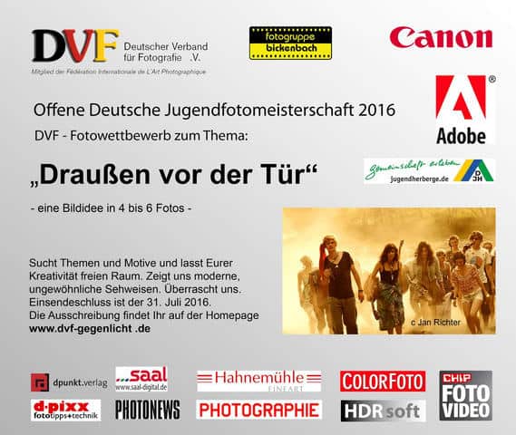 Die Sieger der „Offenen deutschen Jugendfotomeisterschaft 2015“ stehen fest – hier können Sie auf unserer Seite die Top-Bilder betrachten. Aber nach der Meisterschaft ist vor der Meisterschaft und entsprechend wird jetzt zur Teilnahme an der „Offenen deutschen Jugendmeisterschaft 2016“ des DVF (Deutscher Verband für Fotografie) aufgerufen, den wieder die fotogruppe bickenbach ausrichten wird.