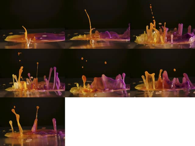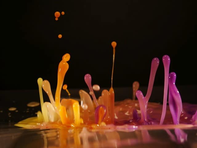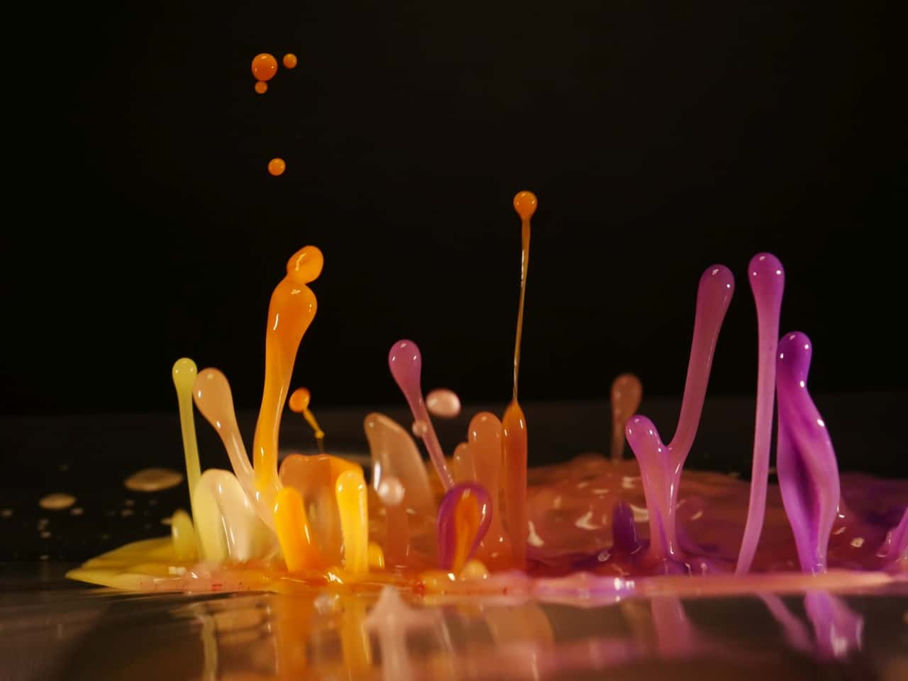 Bei meinen Experimenten war der richtige Moment der, als das angedickte und mit unterschiedlichen Farben eingefärbte Wasser auf einem Lautsprecher anfing zu tanzen – aber sich die Farben noch nicht vermischt hatten. Nur wenige Augenblicke später war dann alles schon wieder vorbei.