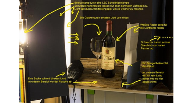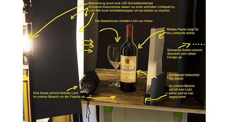 Das Motiv: Einfach eine Flasche Wein und ein Glas. Damit die Aufnahme gelingt, reicht eine einzige Leuchte und ein bisschen was drum herum, aber nichts, was man nicht im Haus hätte oder leicht besorgen könnte. Dazu kommen dann noch je eine ordentliche Portion Improvisationsvermögen, Phantasie und Geduld. Und so sieht …