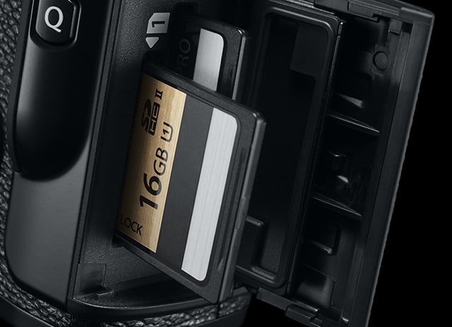 Für die Speicherung der Bilder stehen zwei SD-Karten zur Verfügung. Die beiden Slots sitzen hinter einer Klappe auf der rechten Schmalseite. Auch wenn man JPEGs und RAWs parallel aufnimmt, geht das Speichern schnell. Die großen JPEGs sind meist zwischen 10 und 16 MB groß. Für die RAW-Dateien kann man wählen zwischen unkomprimiert und verlustfrei komprimiert. Die Dateigrößen liegen dann bei ca. 50 MB und um die 28 MB. Ob man nach dem Entwickeln Unterschiede zwischen den RAW-Modi feststellen kann, muss ein späterer Praxistest zeigen.