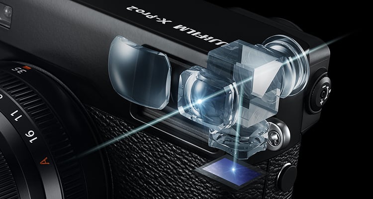 Auch die neue X-Pro ist mit einem besonderen Suchersystem ausgestattet. Der Suchereinblick (mit Dioptrienkorrekturrad) ist wieder links oben (von hinten gesehen) positioniert, wie man es von Messsucherkameras seit Jahrzehnten kennt.
